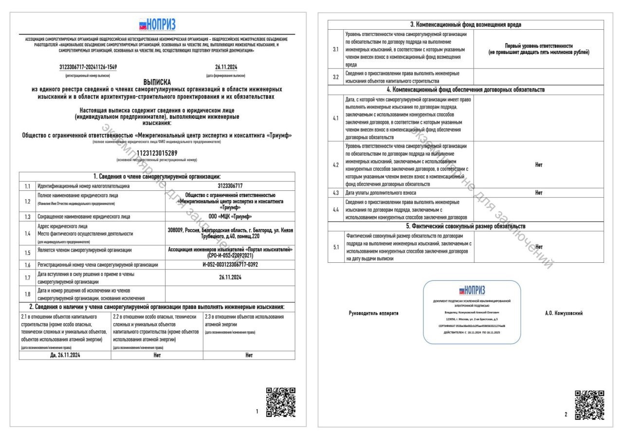 ООО «МЦК«Триумф» состоит в СРО Ассоциация инженеров изыскателей "Портал изыскателей" и имеет право выполнять инженерные изыскания на объектах капитального строительства.
